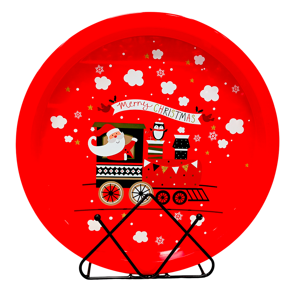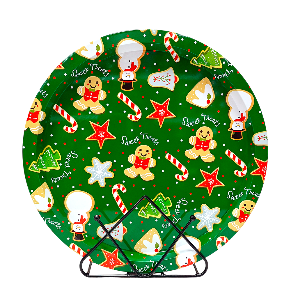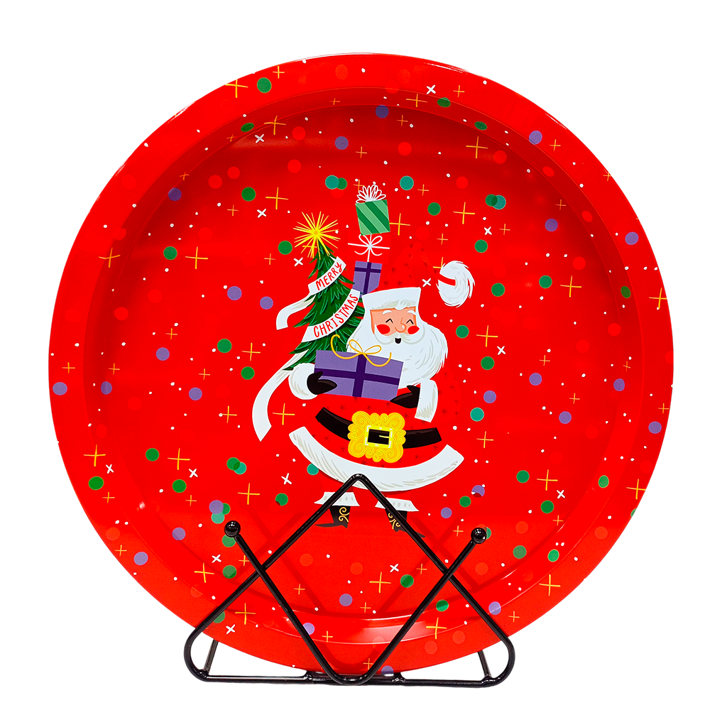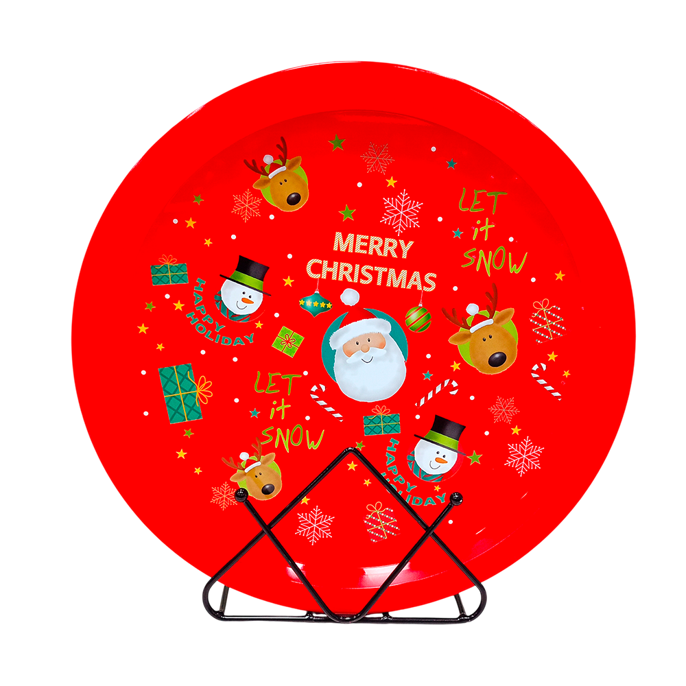 Cada bandeja presenta diseños coloridos inspirados en la Navidad, con motivos como Santa Claus, coronas, muñecos de nieve, copos de nieve o mensajes clásicos como Merry Christmas. Los tonos rojos y verdes metálicos destacan por su brillo y aportan un toque cálido y alegre al ambiente.