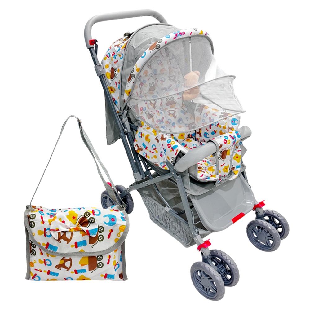 Coche estampado con estructura metálica, asiento acolchado, malla antiinsectos y ruedas dobles. Incluye bolso y canastilla para mayor comodidad.