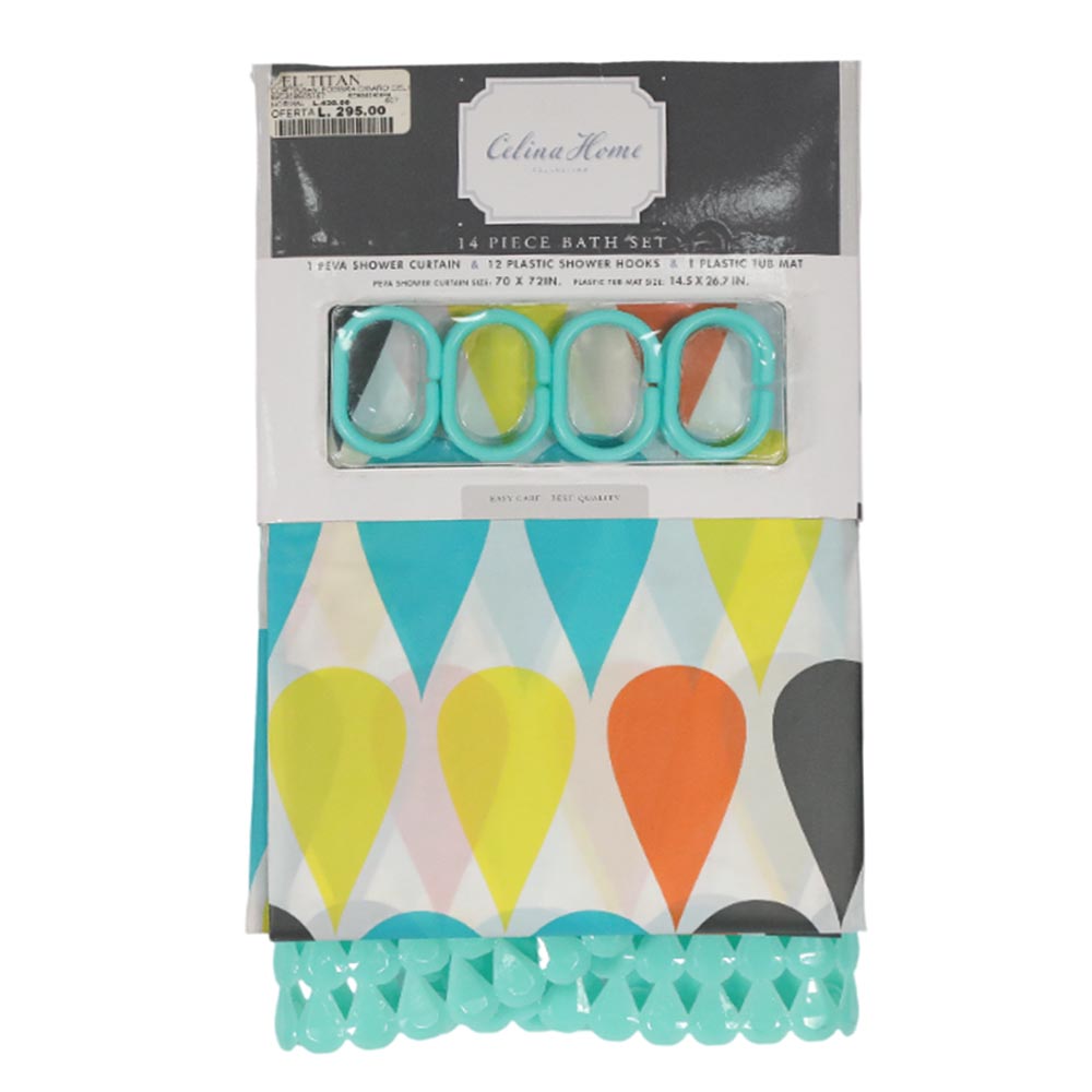 Dale vida a tu baño con el set Celina, que incluye cortina y alfombra. Un diseño fresco y armonioso que aporta calidez y estilo.