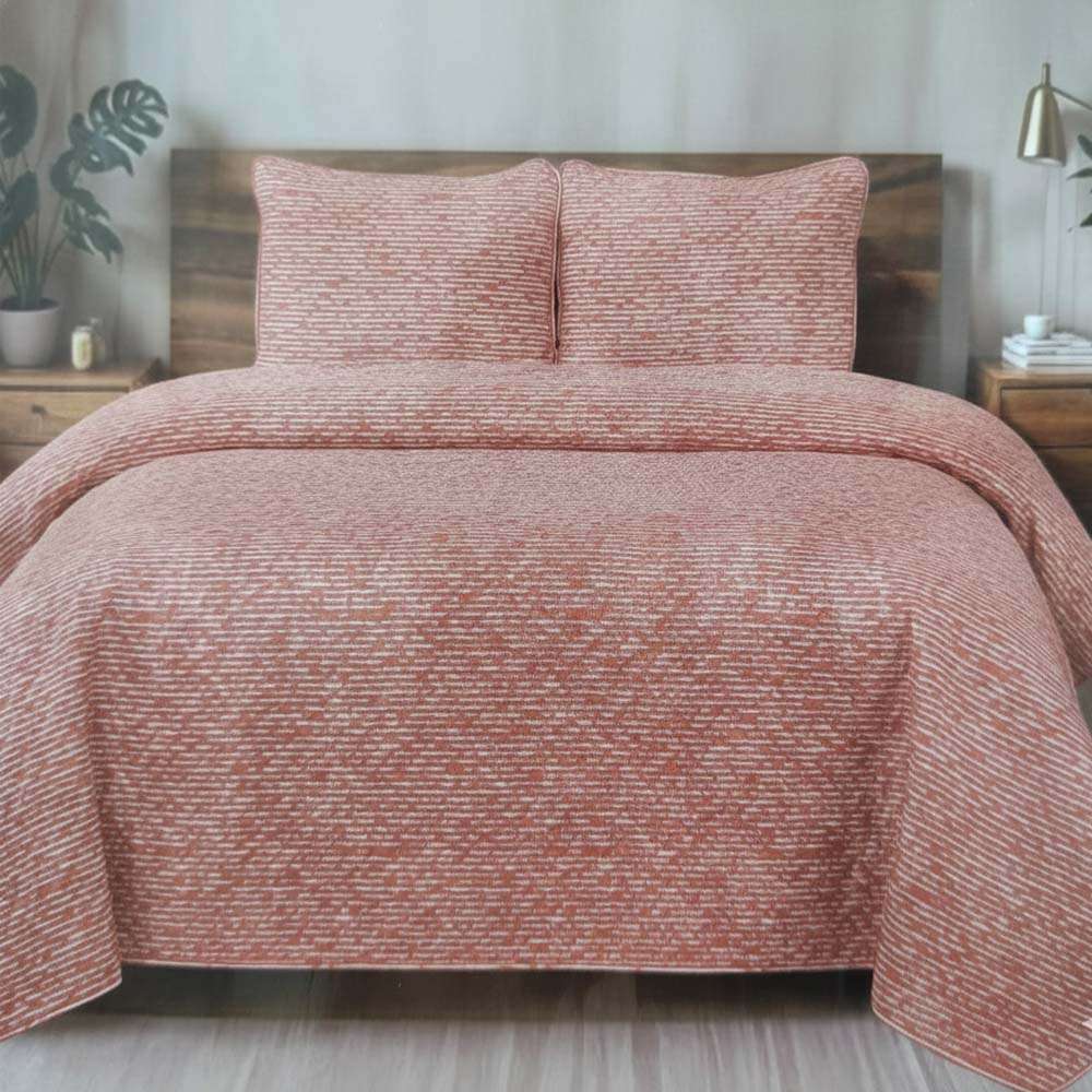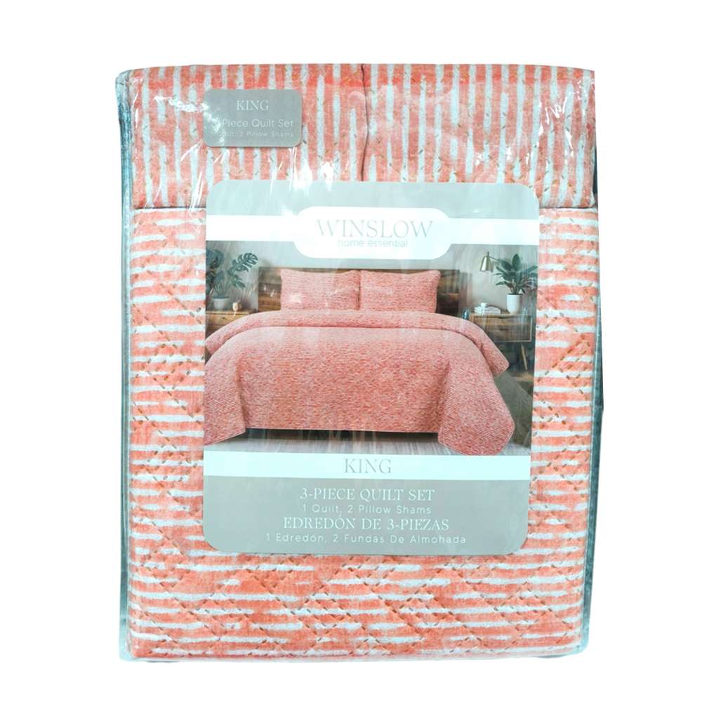 El Edredón Winslow King 3 piezas ofrece comodidad y estilo para tu habitación. Presenta un diseño moderno con patrón de rayas horizontales en color coral y blanco, ideal para quienes buscan un ambiente cálido y ordenado.