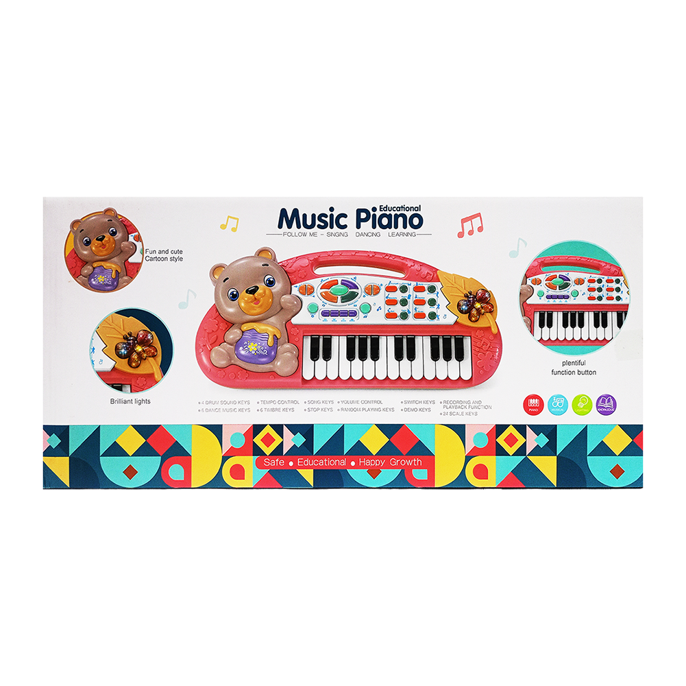 Este piano educativo musical está diseñado para que los niños desarrollen habilidades auditivas y motoras mientras exploran sonidos y melodías. Su estructura está fabricada en plástico resistente con bordes suaves, pensado para un uso seguro y cómodo. El diseño incluye una figura de osito en relieve que añade un toque amigable y atractivo para los pequeños, acompañado de una combinación de colores vivos como rojo, amarillo, morado y turquesa, los cuales llaman la atención y favorecen la estimulación visual.