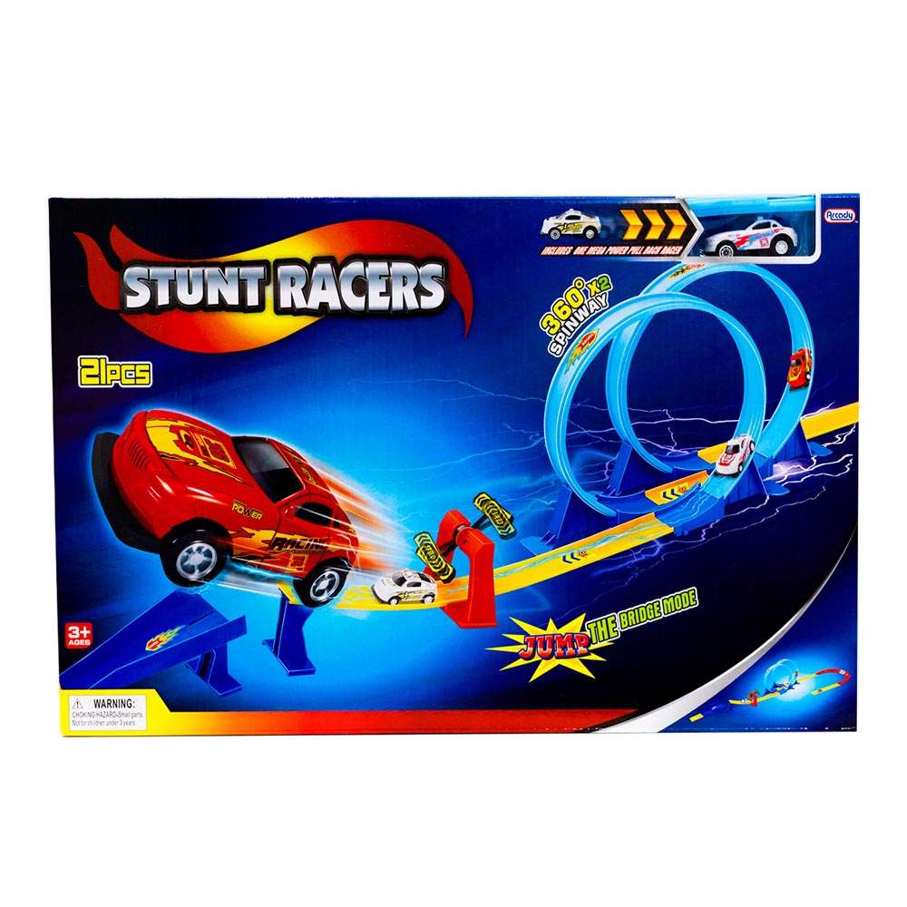 Set de pista con autos de carreras para niños. Diseño colorido, piezas seguras y fácil armado que fomenta la diversión, creatividad y juego compartido.