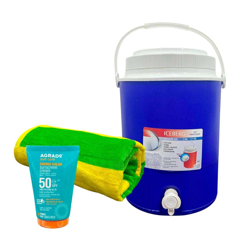 Disfruta del mejor verano con nuestro exclusivo Kit de Verano contiene termo de 7.57 litros, toalla de verano y bloqueador solar.