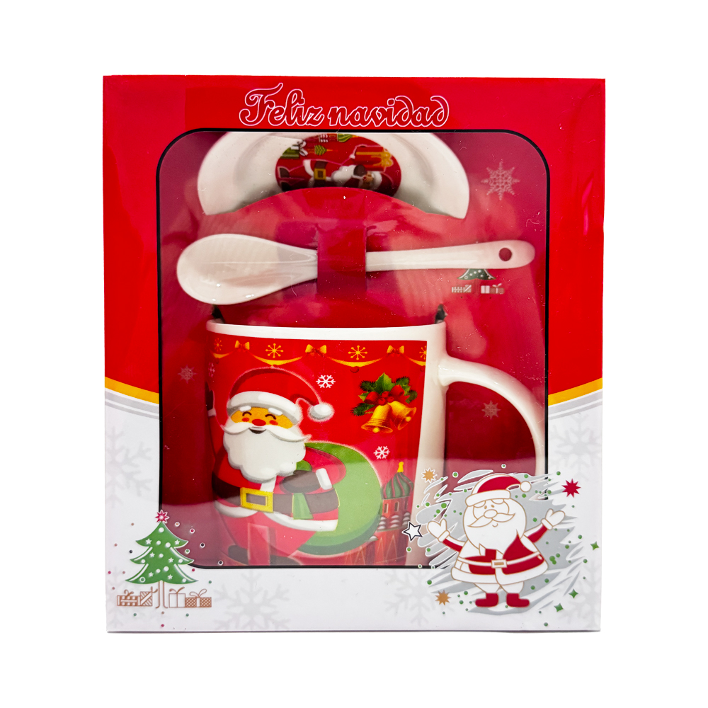 El diseño destaca por su fondo rojo con ilustraciones de Santa Claus, regalos y motivos navideños, logrando una imagen llamativa y festiva que encaja perfectamente con la temporada. La taza cuenta con un asa firme y amplia que facilita el agarre y mejora la experiencia al beber café, chocolate, té u otras bebidas calientes. El plato sirve como soporte para la taza y también es útil para acompañarla con pan, galletas o snacks. La cuchara completa el set y evita tener que buscar utensilios adicionales.