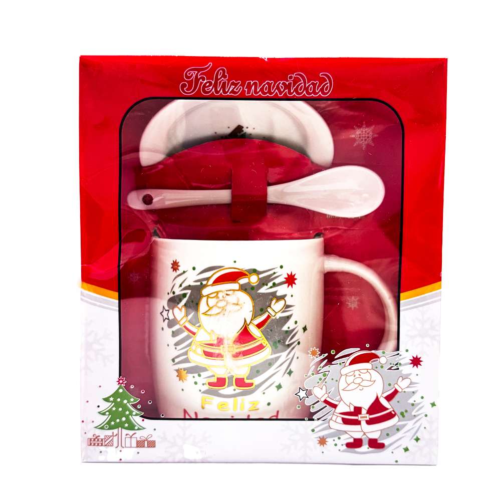 La taza presenta un diseño de Santa Claus con la frase “Feliz Navidad”, mientras que el plato luce un adorno con árbol de Navidad y regalos, aportando un toque festivo a cualquier mesa. Su material resistente soporta bebidas calientes como café, té o chocolate, manteniendo el calor por más tiempo sin afectar el color o el diseño.