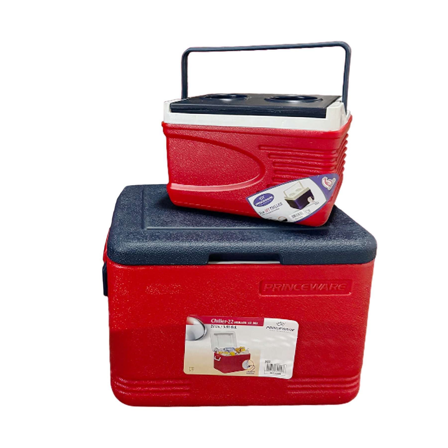 Explora la gama de hieleras Princeware, ahora disponible en un conveniente set que incluye tamaños de 6 litros y 22 litros en color rojo con azul.