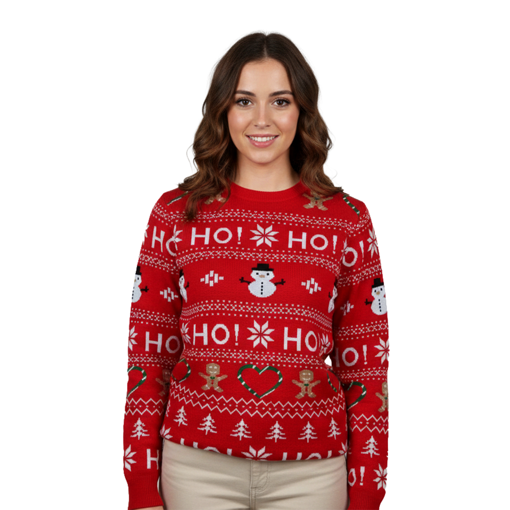 El diseño destaca por su base roja vibrante y patrones clásicos de temporada como copos de nieve, muñecos, árboles y detalles decorativos tejidos directamente en la tela, no estampados, lo que aporta una mejor durabilidad y un acabado más limpio. Los puños, cuello y cintura están reforzados para evitar que se estiren con el uso, ayudando a conservar la prenda por más tiempo.