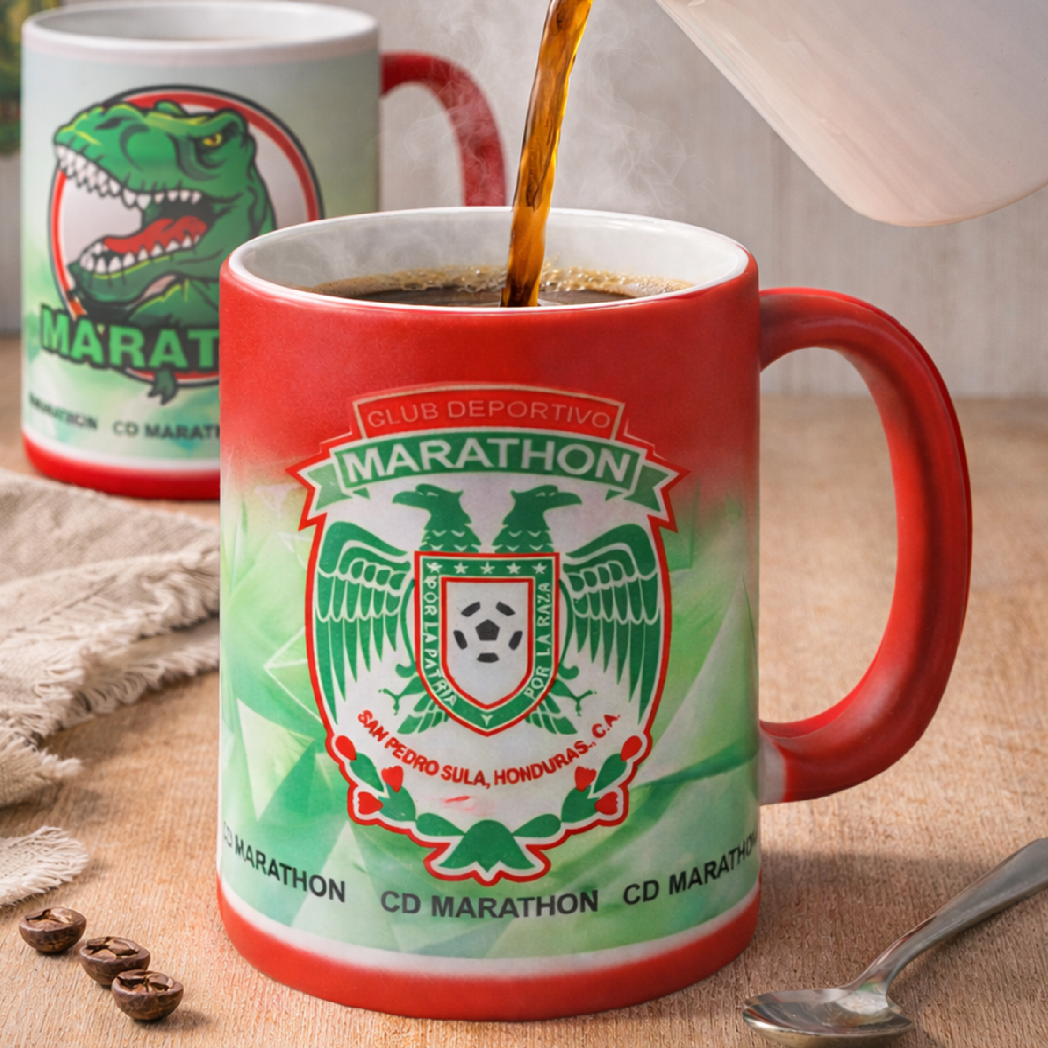 Tecnología Térmica: La taza presenta un color rojo sólido cuando está fría. Al verter café, té o leche caliente, el revestimiento reacciona al calor y revela el escudo oficial del Club Deportivo Maratón y motivos del equipo.